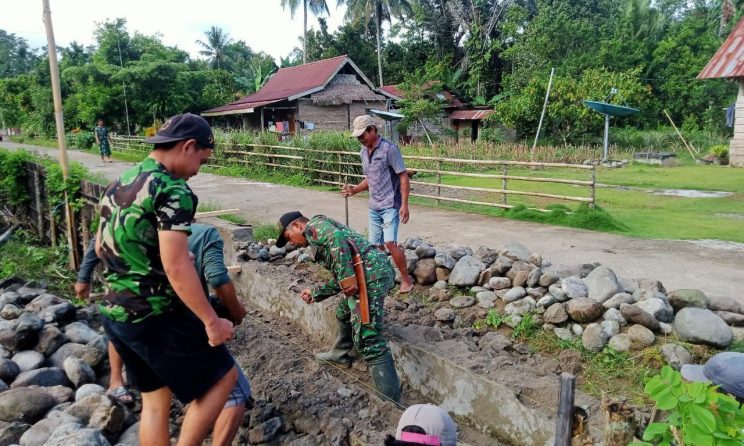 Anggota Koramil 1418-03/Kalukku Bersama Warga Bersihkan Saluran Air di Desa Keang untuk Antisipasi Banjir