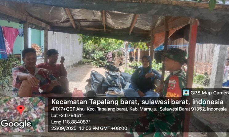 Seputar Sulbar, Mamuju, – Babinsa Koramil 1418-02/Tapalang, Koptu Syamsuddin, melaksanakan kegiatan Pembinaan Wilayah yang dirangkaikan dengan Komunikasi Sosial (Komsos) bersama masyarakat di Desa Ahu, Kecamatan Tapalang Barat, Kabupaten Mamuju, Senin (22/09/2025).