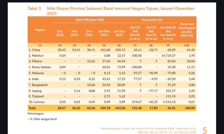 Pada Desember 2025 saja, nilai ekspor Sulbar mencapai US$66,36 juta, meningkat signifikan 131,48 persen dibanding Desember 2024. Hal ini menunjukkan tren pemulihan dan penguatan sektor ekspor daerah yang semakin kompetitif di pasar global.