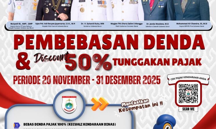 Program ini berlangsung mulai 20 November hingga 31 Desember 2025, memberikan kesempatan luas bagi wajib pajak di seluruh kabupaten se-Sulbar untuk memperoleh keringanan besar-besaran.