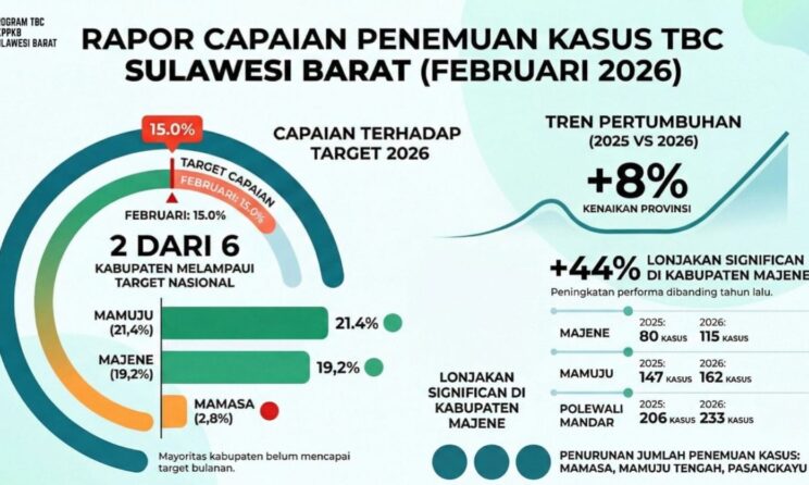 Seputar Sulbar, Mamuju – Capaian penemuan kasus Tuberkulosis (TBC) di Provinsi Sulawesi Barat pada Februari 2026 menunjukkan tren positif. Data Dinas Kesehatan, Pengendalian Penduduk dan Keluarga Berencana (DKPPKB) Provinsi Sulawesi Barat mencatat peningkatan sebesar 8 persen dibandingkan periode yang sama tahun 2025.