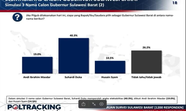 Seputar Sulbar, Mamuju, – Pasangan Calon Gubernur dan Wakil Gubernur Sulawesi Barat (Sulbar) nomor urut 3, Suhardi Duka-Salim S Mengga (SDK-JSM), unggul dalam survei elektabilitas yang dilakukan oleh Poltracking Indonesia.
